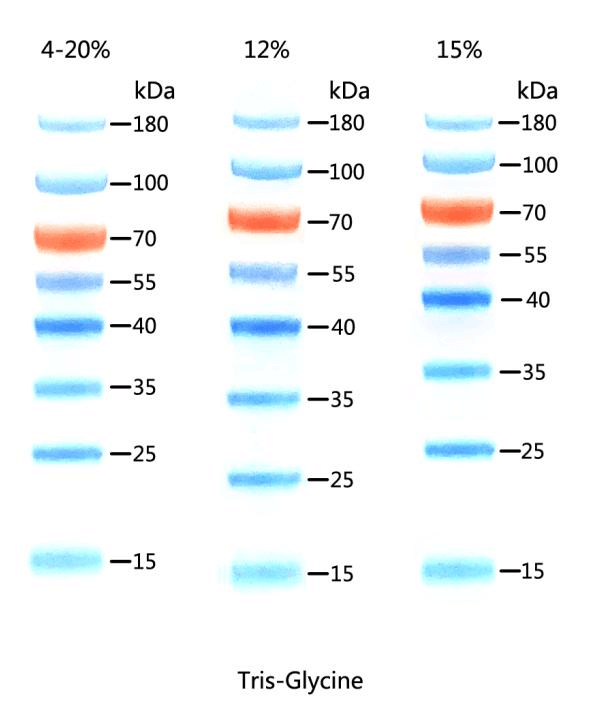 | 条带分子量 (kDa) | 15, 25, 35, 40, 55, 70, 100, 180 | 10, 15, 25, 35, 40, 55, 70, 100, 150, 250 | 10, 15, 25, 35, 40, 55, 70, 100, 130, 180 | 10, 15, 25, 30, 35, 40, 55, 70, 80, 100, 150, 250 |